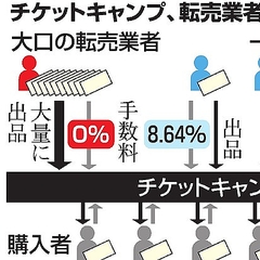 チケキャンの利用規約は「転売する目的で得たチケットを出品してはならない」と定めている。捜査関係者によると、大口の転売業者が他社のサイトに流れないよう、手数料をゼロにして扱う枚数を増やす狙いがあったとみている。