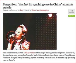 自殺未遂をしたのは中国の若手歌手ファン・ジユアンさん(21歳)。彼女は昨年9月、四川省の成都(せいと)で開かれた女性歌手の祭典でステージに立った。その際に、あろうことかマイクを逆さに持ってしまい、それに気付かずに歌唱を披露。聞こえないはずの歌声が聞こえることから、クチパクの事実が発覚した。今年に入って、文化省がクチパクを禁止する法律を施行し、彼女は摘発され罰金5万元(約63万円)の刑に処されたという。