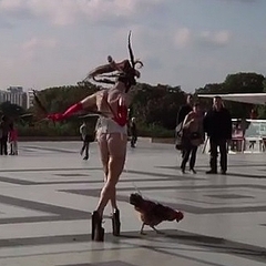 パフォーマンス・アーティストとして活動してきた、スティーヴン・コーエンという南アフリカ国籍の白人男性。誰にも真似できない、そして誰のパクリでもない斬新な芸術表現を模索してきた彼は昨年9月、エッフェル塔の観光客も多数いる「トロカデロ広場」でとんでもないパフォーマンスを繰り広げ、公然わいせつの罪で逮捕された。こちらの画像は5日、『AFP news agency』さんが”“Artist Steven Cohen convicted for rooster-penis dance”というタイトルでYouTubeに投稿した動画のスクリーンショット。羽飾りを効かせたコルセットスタイルと超ハイヒールでエッフェル塔の前に繰り出し、自分のペニスに紐をつけて雄鶏を散歩させているところである。