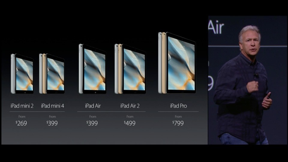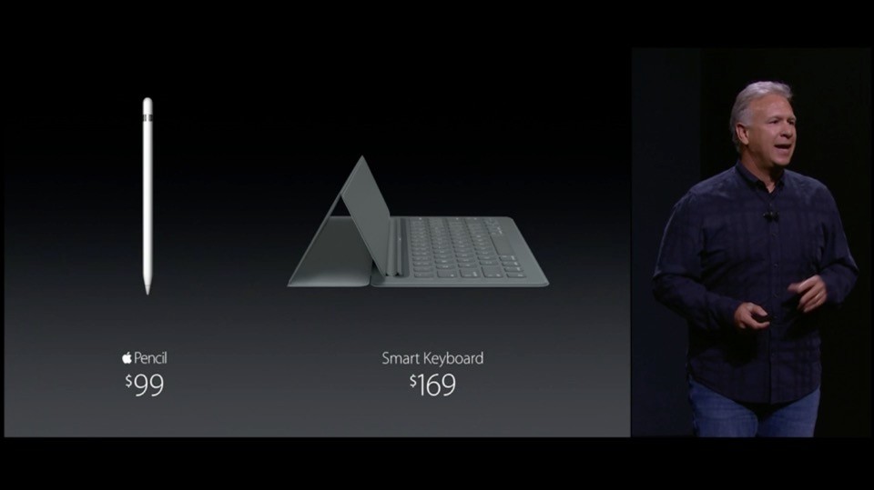 iPad Proの価格。32GBが799ドル、128GBが949ドル、128GBでLTE対応が1079ドル。Smart Keyboardが169ドル、Apple Pencilが99ドル。