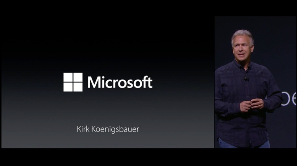 iPad ProのデモにMicrosoftとAdobeの担当者が登壇。なんとAppleの発表会でMicrosoftのロゴが見れるとは。Officeにてインク機能のデモを行い、マルチウィンドウで左右に並べて編集できることを紹介。
