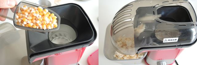 (1) まずはポップコーンの準備です。ポップコーンメーカーに乾燥ポップコーンを入れます。(2) 運転をスタートすると、1分ほどでポンポーンとポップコーンがはじけます。