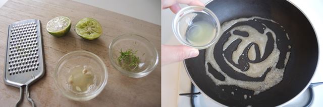 (3) すだちハニー味の材料を用意しましょう。すだちの皮はすりおろし、汁をしぼっておきます(小さじ1程度)。(4) フライパンにはちみつときび砂糖を入れて中火にかけ、煮立ってきたらすだちの汁を加えます。