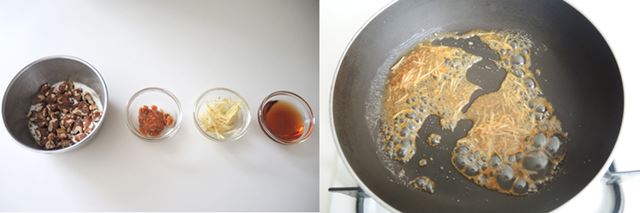 (8) 続いて、メイプルジンジャー味を作りましょう。しょうがは千切りにし、くるみはできれば炒って粗く切っておきます。(9) フライパンに<a>を入れ中火にかけます。1分程度でふつふつしてきますので、火を止めておきます。