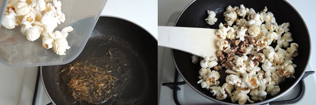 (10) ポップコーンを加えて味を絡めましょう。(11) くるみも加えて混ぜます。