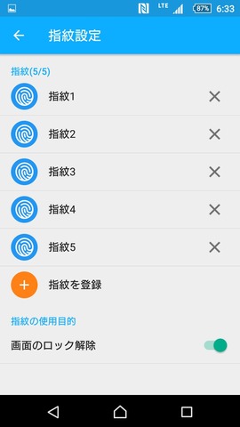 そのため、昔の認証精度があまり高くなかったバッドノウハウ的なやり方である同じ指を何個か登録するという方法で認証確率はほぼ100%になったような感じです。なお、Xperia Z5シリーズでは5つまで指紋が登録可能です。