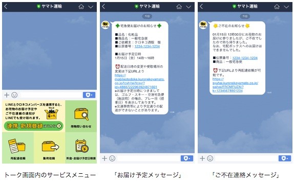 ヤマト運輸は15日、スマートフォン(スマホ)など向けコミュニケーションサービス「LINE(ライン)」( http://line.me )を使って「お届け予定メッセージ」や「ご不在連絡メッセージ」、荷物問い合わせなどの各機能の提供を2016年1月19日(火)昼ごろより提供開始すると発表しています。