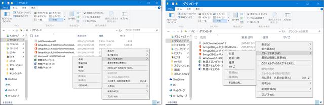 文字サイズ変更前と変更後のエクスプローラーの様子。「タイトルバー」「メニュー」「アイコン」の文字サイズを変えたので、タイトルバーにあるフォルダーの名前、アイコンの名前、右クリックメニューなどが大きく表示されるようになった。メニューのサイズを変えてたので、リボンUIのリボンの大きさも変化している