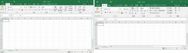 「Excel 2016」を起動してみると、こちらもメニューの表示サイズが変わっている。タイトルバーは、上書き保存のボタンや最大化/最小化ボタンなどの大きさが変わっているが、ファイル名の大きさは変わっていない。こういうアプリもある