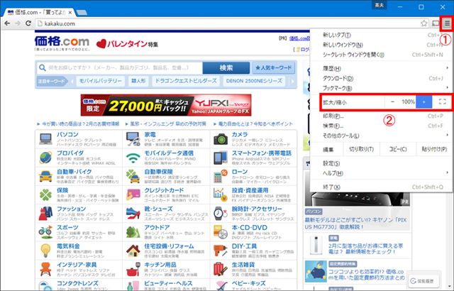 グーグルの「Google Chrome」の場合は、右上にある「Google Chromeの設定」ボタン(1)をクリックすると、表示されるメニューの中に拡大・縮小のボタン(2)がある