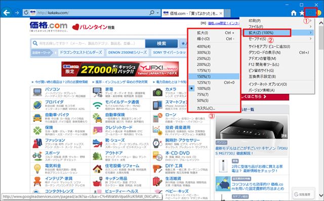 Windows 10にはEdgeのほかに「Internet Explorer」(IE)も搭載されている。IEでは右上の「ツール」ボタン(1)をクリックして、表示されるメニューの中の「拡大(Z)(100%)」(2)にマウスカーソルを合わせると、表示倍率を選べる(3)