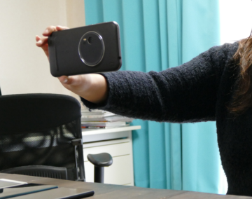 撮影者は、片手でスマホのレンズと反対側の端を持ち、肩の高さで肘を伸ばした状態で椅子に着席。スマホがデスクの端に揃うように調節し、そこからズーム機能を使って、被写体をアップで撮影しました。