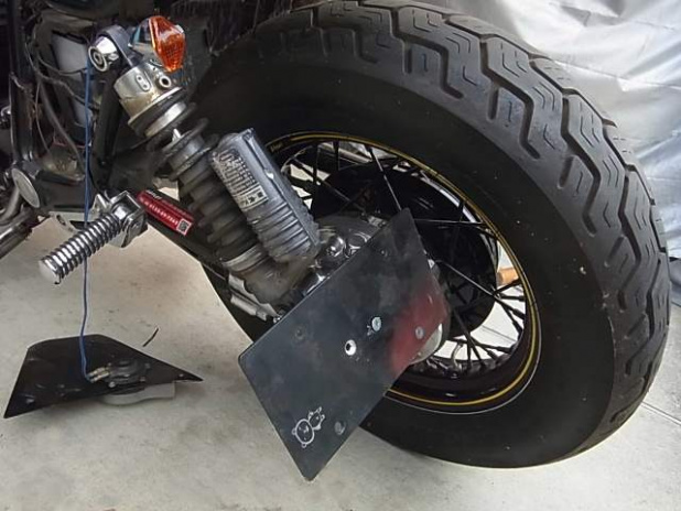 よくSS系のバイクなどで、リアをスマートにするために車体を後ろから見てナンバーを奥側に折り込んでいるカスタムがあります。