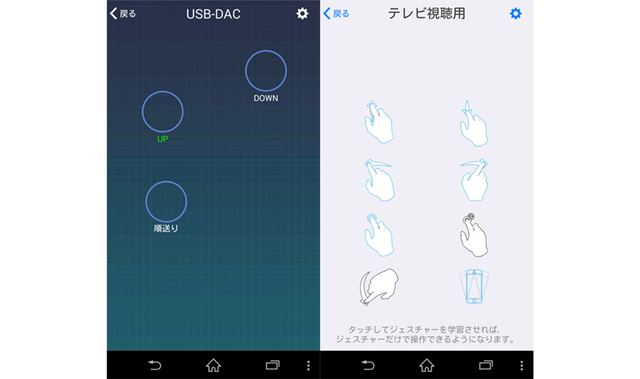 自分で好きな場所にボタンを配置できるカスタマイズメニュー(左)と、ジャスチャーに対してリモコンの内容を学習させることができるジェスチャの画面。筆者は、テレビ視聴でよく使う機能をジェスチャに持たせており、左右のフリックはチャンネル変更、上下のフリックはボリューム調整、シェイクは入力切り替えといった感じで登録している