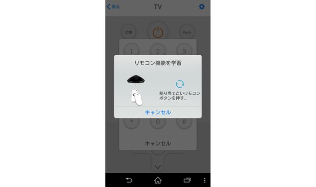 アプリ上の学習させたいボタンを押すと、ポップアップが現れる。このタイミングでは、すでに学習待ち状態に切り替わっており、あとはリモコンをかざして、覚えさせたい内容を学習させるだけだ