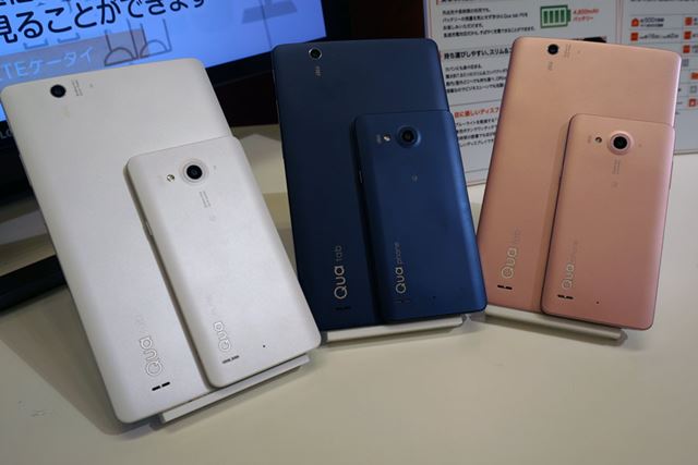 カラーバリエーションは左からホワイト、ネイビー、ピンクの3色。組み合わせて使うことを想定して「Qua phone PX」と「Qua tab PX」のデザインモチーフやカラーは共通
