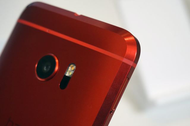 従来の「HTC J」シリーズは、樹脂製ボディが特徴だったが、この「HTC 10」は金属製ボディを採用。サイズは、約72(幅)×146(高さ)×9.2(厚さ)mmで、重量は約161gとなっている。IPX5の防塵仕様はクリアしているが、防水仕様とはなっていない。ただ雨や、水滴がかぶる程度の生活防水には対応しているという説明を受けた。