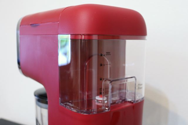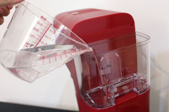 タンクに水を投入。一般的なコーヒーメーカー同様、タンクには目盛りが付いているので、軽量カップいらず。ただ、目盛りは本体の真後ろなので、本体にタンクを装着したままだと見えづらい。注水の際は、本体から外したほうがいいかもしれない