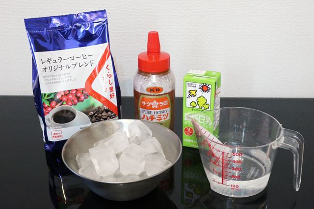 材料はコーヒー粉、家庭で製氷した氷、牛乳(今回は豆乳を使用)、砂糖(今回ははちみつを使用)、水。普段から家でコーヒーを淹れる人なら常備していそうなものだけで作れる