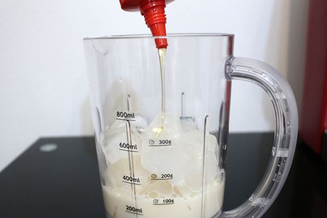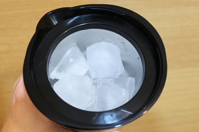 コンテナに、氷→その他の材料の順で投入する。なお、コンテナの定格容量は800mlなので、800mlの目盛りを越えないようにする