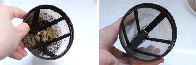 コーヒー粉を入れたメッシュフィルターは、さっと洗い流すだけでほぼきれいになる。思いのほか手入れは楽だ
