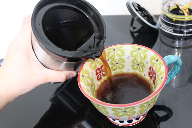 次に、同梱されている「真空ステンレスサーバー」を使用して、ホットコーヒーを淹れてみた。一度に最大で120mlのカップ4杯分(480ml)のコーヒーができる。