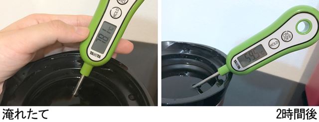 淹れたコーヒーは、「真空ステンレスサーバー」に入れておけば、2時間後(右)くらまではおいしく飲めそう
