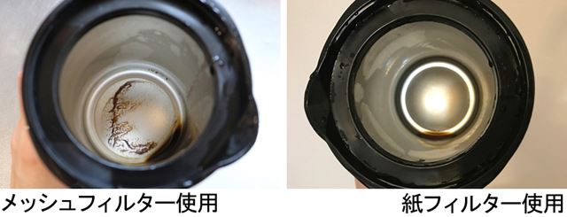 メッシュフィルター使用の場合は「真空ステンレスサーバー」にもカップにも、細かいコーヒー粉が残るが、紙フィルターの場合、コーヒー粉はまったく残っていない