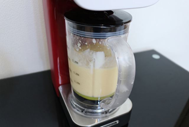 さっそく、コーヒーフラッペを作ってみることに。通常、自宅でコーヒーフラッペを作ろうと思うと、コーヒーを淹れ、そのコーヒーをほかの材料と一緒にミキサーでかくはんするという手順になる。2台の道具を使うとなると手間がかかるだけでなく、洗い物も増えてしまうが、それが1台でできるというのだから、うれしい限り。