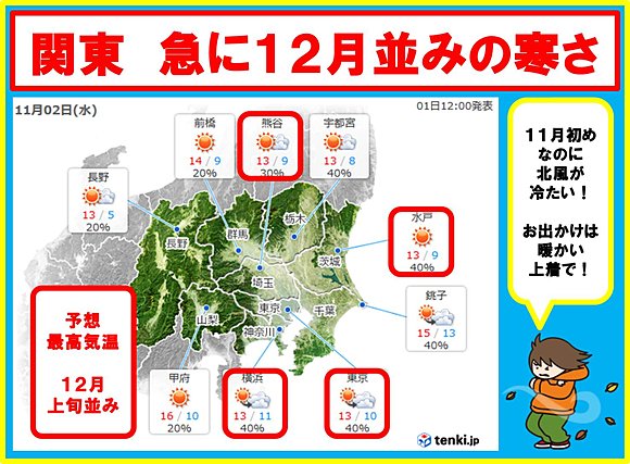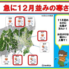 ちなみに、2日の東京は、最高気温が13度と予想されている時間に、4メートルの北風が吹きそうです。ということは、体感的には、東京の気温は9度と、昼間も一桁でしょう。「まだ11月だから」と油断しないで、暖かい上着を着て、お出かけ下さい。