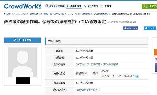 保守系のブログ記事を1本800円で作成するよう依頼している人がいると判明し、ネットで話題になっている。クラウドワークスに9月20日、「政治系の記事作成。保守系の思想を持っている方限定」という仕事が掲載された。