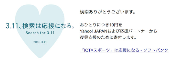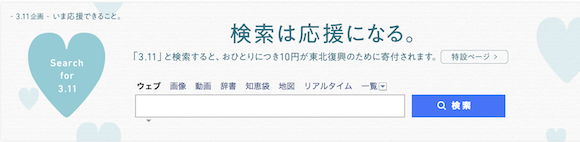 ÅìÆüËÜÂç¿ÌºÒ¤ÎȯÀ¸¤«¤é7ǯ¤È¤Ê¤ë3·î11Æü¡¢Yahoo! JAPAN¤Î¸¡º÷Á뤫¤é¡Ö3.11¡×¤È¸¡º÷¤¹¤ë¤È1¿Í¤Ë¤Ä¤10±ß¤òÅìËÌÉü¶½¤Î¤¿¤á¤Ë´óÉÕ¤¹¤ë¡Ö¸¡º÷¤Ï±þ±ç¤Ë¤Ê¤ë¡£¡×¤¬¼Â»Ü¤µ¤ì¤Æ¤¤¤Þ¤¹¡£