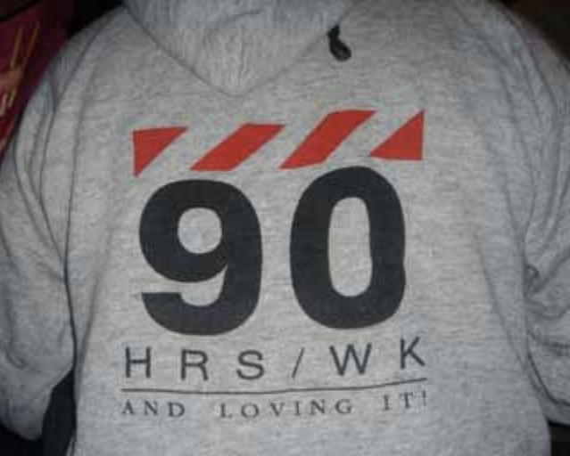 Macintosh開発時の話は本当で、実際にスタッフが「週90時間、喜んで働こう!」とプリントした服を着ていた写真が残っている。