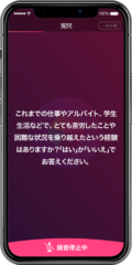 まずアプリが質問を読み上げ、スマホの画面にもその質問文が表示されます。候補者が回答する番になると、1分間の回答時間が画面に表示され、その間に答えなければいけません。回答中はスマホのカメラが起動して、答えている様子が動画で撮影されます。