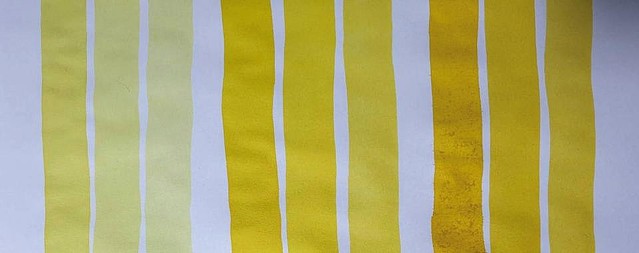 こちらの写真は、スポンジを使って引いた線。左から3本ずつ「アカシア」「レンゲ」「ボダイジュ」の順だ。スポンジについたインク量が減っていくので、少しずつ薄くなっている。