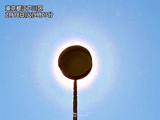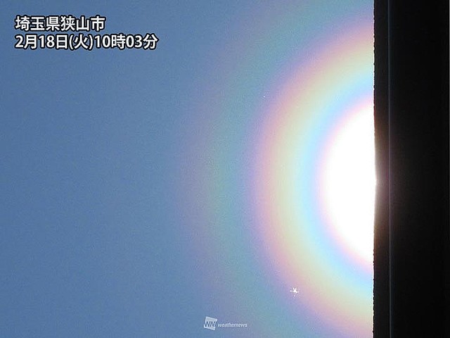 今日18日(火)の関東地方は朝から青空が広がっています。春の日差しを届けている太陽の周りに、虹色の環が現れています。これは「花粉光環」と呼ばれるもので、スギ花粉により太陽の光が回折することで見られる現象です。スギ花粉が空気中に多く飛散していることを示しています。千葉で2時半頃に最大瞬間風速21.7m/sを観測するなど未明まで強風が吹き荒れていたことや、東京で10時の湿度が33%まで下がり、晴れて空気が乾燥していることなど、花粉が飛散しやすい条件がそろっています。ウェザーニュースの観測で午前中の飛散状況を見ると、南部で多く飛散している状況です。