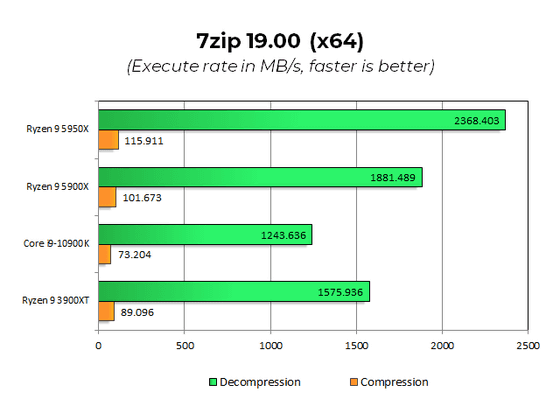 ExtremeTechは脚スク・解答ツールの7-zipでの圧縮・解凍速度を計測。それによれば、圧縮・解凍ともにRyzen 9の圧勝で、特にRyzen 9 5950Xの解凍速度はCore i9-10900Kのダブルスコアをたたき出しています。