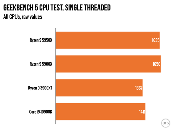そして、Geekbench 5によるシングルスレッド性能でも、わずかながらCore i9-10900KがRyzen 9 3900XTを上回っています。しかし、Ryzen 5000シリーズはどのベンチマークテストでもCore i9-10900Kを引き離す性能を見せており、Zen 3アーキテクチャCPUの進化がはっきりと表れています。Ars Technicaは、「発表でのAMDの主張がしっかりと裏付けられた」と評価しています。