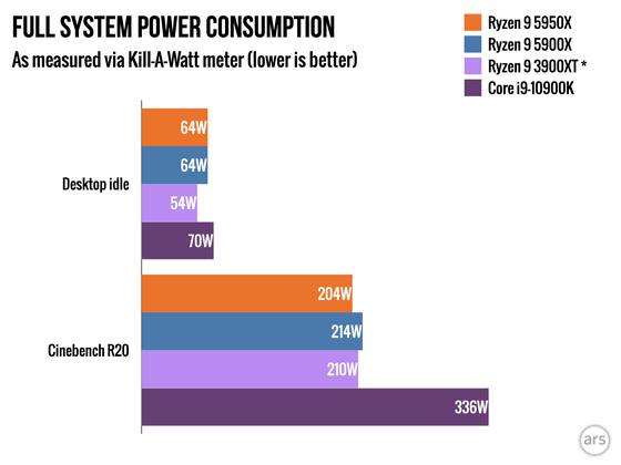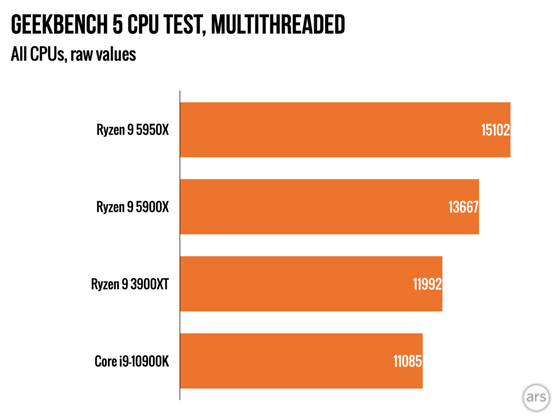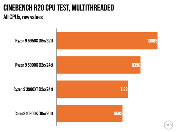 また、IT系ニュースサイトのExtremeTechも、Ryzen 9 5950X・Ryzen 9 5900X・Intel Core i9-10900Kの比較を行っています。