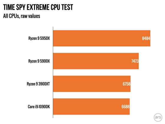 一方で、4K解像度と8コア以上のCPUが対象で、GPU負荷がより高いTimeSpy Extremeテストの結果が以下。Ryzen 5000シリーズの2種がRyzen 9 3900XTとCore i9-10900Kよりも高いスコアを出しています。Ars Technicaは「Time Spy Extremeは4kゲーミングパフォーマンスをモデル化し、Time Spyよりも多くのコアとより高度なCPU命令を利用することが可能です。Ryzen 9 5900XとRyzen 9 5950Xは、前世代のRyzen 9 3900XTとIntel i9-10900Kの両方を上回る健全なリードを提供しています」とコメントしました。