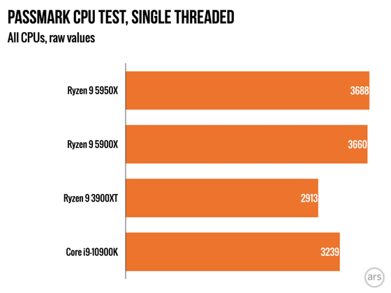 Passmarkによるシングルスレッド性能では、Core i9-10900KがRyzen 9 3900XTより10%ほど高いスコアをたたき出しています。。