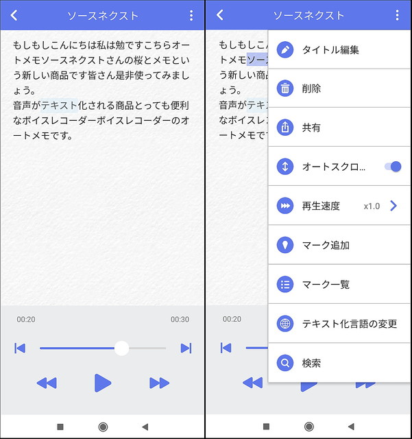 録音した音声をテキスト化した画面(左)と、テキスト表示でのメニュー画面(右)