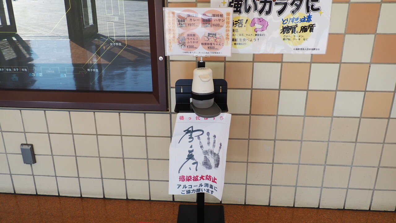 入場口は普段の千秋楽よりも閑散としています。まだチケット販売中の緊急事態宣言ということで、売り逃しもあったでしょうか。前後の人もなく入場は流れるようにスムーズです。あまりにスムーズすぎて「カメラによる顔認証タイプの体温計」を僕が見てもいない段階から「こちらへどうぞー」と館内に通されたほど。「すごい反応がいいヤツなんだよな?」「見た感じ大丈夫そうなら体温計は見ない、とかじゃないよな?」「万一見てなくても、問題があれば音が鳴るんだよな?」という質問はグッと飲み込みます。もしコレを聞いて「あー、これ今壊れてるんすわ」という回答が来たら話し合いが長くなりそうなので…。