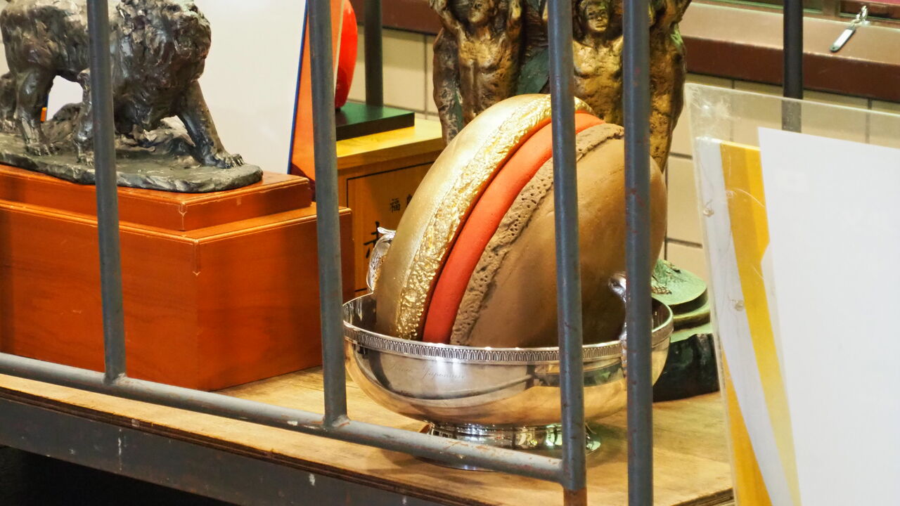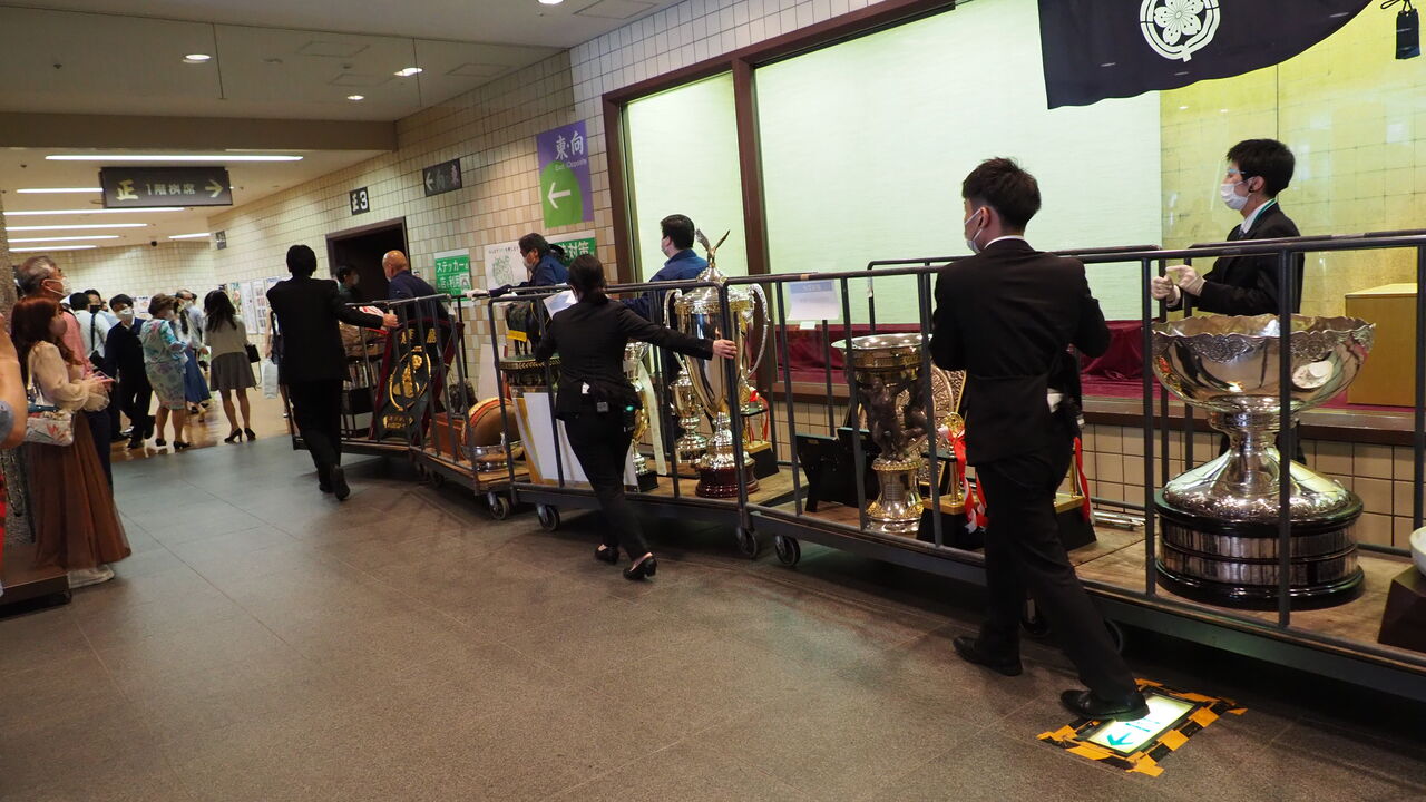 さて、幕内の取組が始まり、普段なら土俵に集中している頃も引きつづき散策をつづけていると、またも珍しい光景が。「毎回やっているのだろうが、あえて見に来たことはなかった」天皇賜杯ほかのトロフィー類を展示ケースから運び出していく場面に遭遇したのです。改めて見ると雑というか、「よっこらせ、どっこいせ」くらいのノリで運び出されていくトロフィーたちの扱いは極めてカジュアルです。もちろん落としたり投げたりはしませんが、「万が一手が滑ったらしゃーない」という割り切りは垣間見えます。なにせ、わりと大きいヤツでもひとりで持ってひとりで運ぶのですから。ひとりが手を滑らせたら即座にドンガラガッシャーンです。