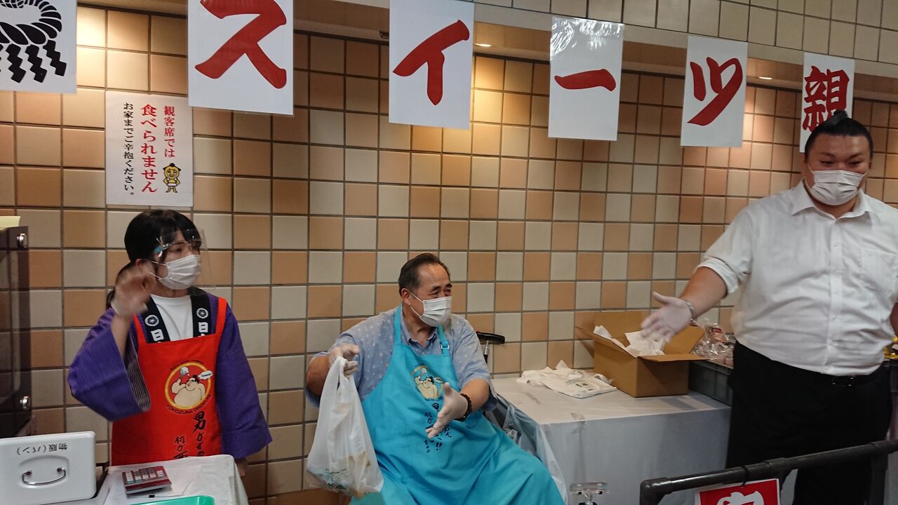 ↓スイーツ親方の店で大乃国と勢が売り子をつとめます!