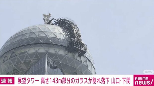 山口県下関市の「海峡ゆめタワー」で作業員が乗るゴンドラが窓ガラスに接触し、割れたガラスが落下する事故があった。けが人はいなかった。