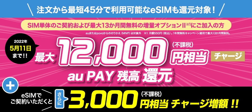 さらにeSIMなら追加で3,000円相当が追加されるため、MNPでは最大15,000円相当、新規契約では最大6,000円相当が還元されます。なお、MNPでは増量オプションIIに未加入の場合にはSIMカードで6,000円相当、eSIMで9,000円相当の還元となります。その他、UQ mobileオンラインショップでは事務手数料3,300円(税込)がかかるのでご注意ください。