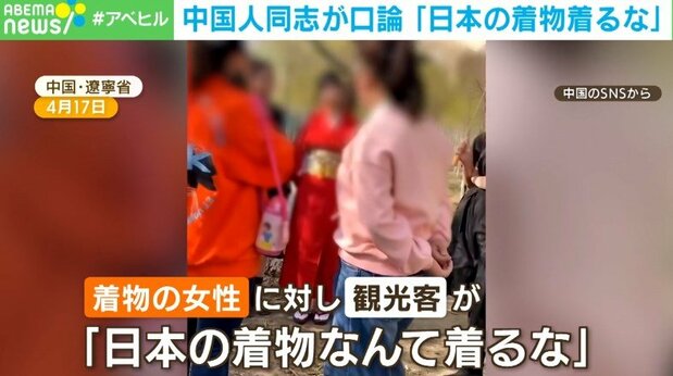 「私が親ならひっぱたいているわ」。4月17日、中国・遼寧省で和服の着用について言い争いが起きた。周囲の人が動画を撮影している。