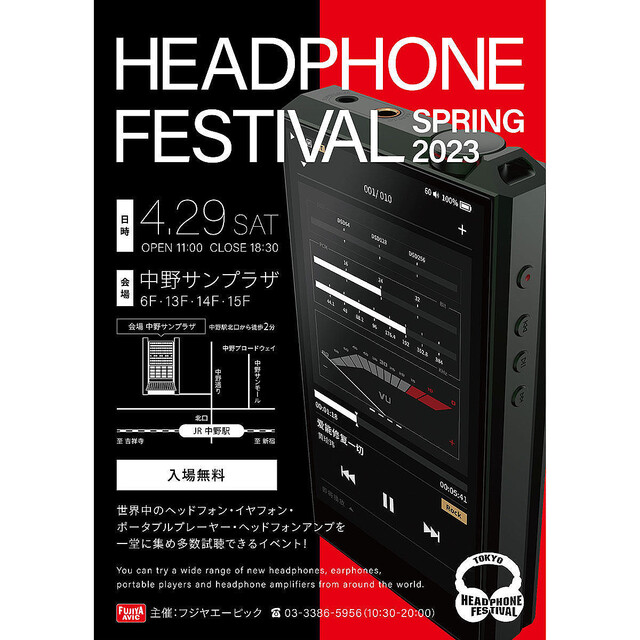 フジヤエービックは、「春のヘッドフォン祭2023」を東京・中野サンプラザにおいて4月29日に開催する。一般入場は無料で、事前登録制だが入場者数の制限は設けない。既報の通り、中野サンプラザは6月30日をもって営業休止、7月2日の閉館が決定しており、今回が同会場で開かれる最後のヘッドフォン祭となる。