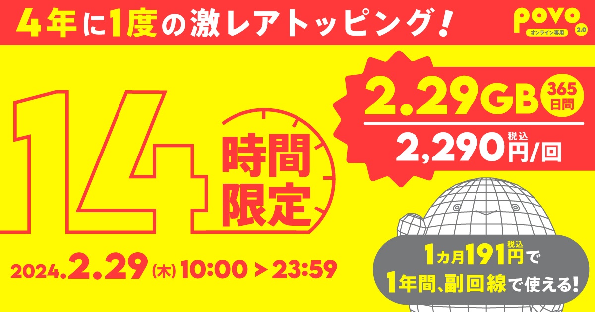 ・povo2.0、4年に1度のうるう年を記念した「データ追加2.29GB(365日間)2,290円」トッピングを2月29日午前10時から14時間限定で提供